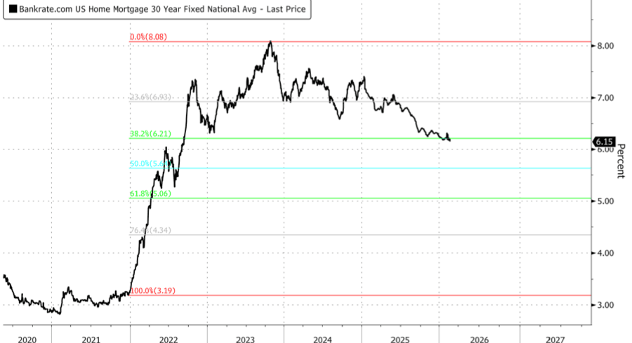 Here's the latest read on the 30-year fixed mortgage rate from Bankrate, with rates hovering around 6.15%.
