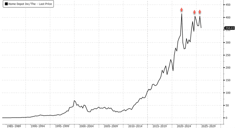 Shares of Home Depot are slightly lower in premarket trading in New York, though nothing too notable. However, the long-term chart of the stock shows three clear rejections at the $400 level.