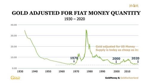 The current gold price is not even reflecting the money printing and credit creation that we have seen so far. The graph below shows that in relation to US money supply, gold today is as cheap as it was in 1970 when the gold price was $35 or in 2000 when gold was $288.