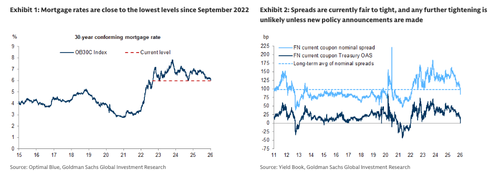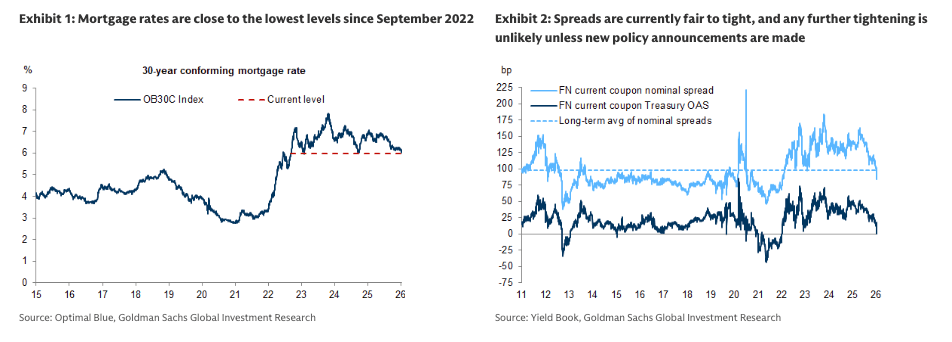 On January 8th, President Trump posted on social media that he has instructed his representatives to buy $200 billion of mortgage bonds. Subsequently, Director Pulte and Secretary Bessent have essentially confirmed that the buying is being carried out by the government sponsored enterprises (GSEs) – Fannie and Freddie. Although very limited details about the program are available so far, the agency MBS market has quickly priced in the program with production coupon spreads tightening around 14-15bp so far. We believe the spread tightening so far is consistent with a program of this magnitude and hence believe that it is fully priced-in. Mortgage rates have also declined in tandem and are now close to the lowest levels since September 2022 (Exhibit 1). This should improve affordability and improve sentiment in the housing market ahead of the key spring homebuying season. We believe that the cumulative decline of around 80bp in mortgage rates since June 2025 could boost existing home sales by at least 5-7% in 2026 vs. 2025. Moreover, it is possible that the administration could push new Fed leadership to provide additional support to housing by reinvesting monthly run-offs from the Fed’s portfolio back into MBS. However, as we noted recently, if the $200 billion purchase program is a one-off, and there are no other MBS purchase programs from the GSEs/Fed/Treasury, then MBS spreads are likely to end the year wider vs. current levels. Agency MBS nominal spreads are already tighter vs. their longer-term average, and OASs are at levels last observed during the Fed’s QE purchase program (Exhibit 2). Therefore, the key risk for the housing market is that the decline in mortgage rates over the past two days reverses by the end of the year.