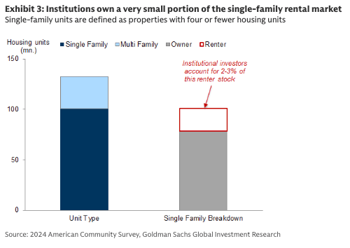 The other major housing policy announcement from last week was President Trump’s intention to ban institutional investors from buying single-family homes. While the goal of this policy is to reduce competition from institutions and increase supply/reduce prices for individuals, we believe the national impact will be quite small. In aggregate, industry estimates show that institutional investors own less than 0.5% of total housing stock and around 2-3% of rental housing stock (Exhibit 3). Estimates from Cotality show that institutions owning 100+ units account for about 5% of recent home purchase activity. The rental housing market is largely dominated by smaller investors, who own around 79% of the total rental units. The impact could be slightly larger in some of the sunbelt metros where institutional investors have a greater presence. As prices of existing homes have soared in recent years, large single-family rental (SFR) operators have shifted towards built-to-rent homes, where they have better control over unit economics, rather than buying homes from MLS. These homebuilding operations provide much-needed supply, and we believe will not be included in any potential institutional purchase ban. Built-to-rent home volumes have averaged approximately 15k per quarter over the past year. Finally, Secretary Bessent spoke about the institutional SFR ban during an interview at the Economic Club of Minnesota last week and his comments suggest that the institutional SFR ban would not apply retroactively. While we need to see the actual language when and if Congress approves the legislation, it appears the administration would be comfortable with institutional SFR operators retaining the properties they already own. This removes a major headwind to the housing market.