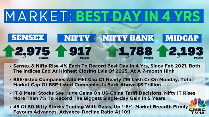 Monday trading saw the Nifty50 close above 24,000; and BSE Sensex rallied 3,000 points to cross 82,400. Overall this constituted a sharp rally of nearly 4% in India’s benchmark indices.