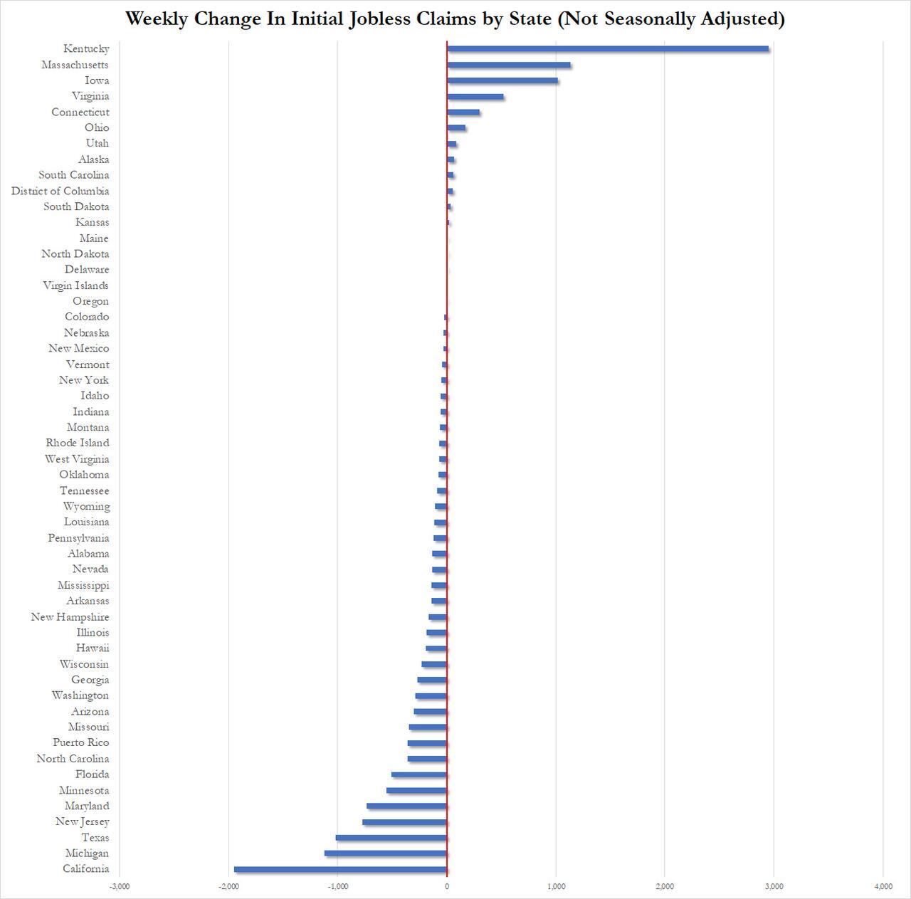 A breakdown of initial claims by state does not show any dramatic outliers: Kentucky saw the biggest increase in initial claims, up almost 2K, while claims in California dropped by 1,948.