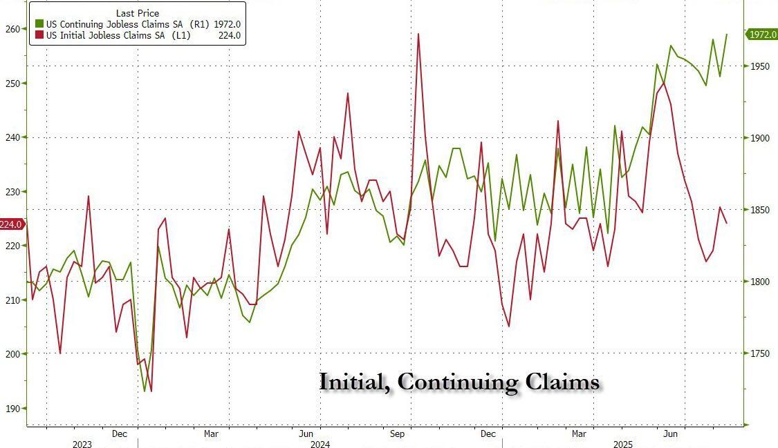 Meanwhile, the relentless rise in continuing jobless claims continues, and in the latest week rose to 1.972 million, up from 1942 million, and above the 1.960 million expected; it was also the highest print since the covid crash.