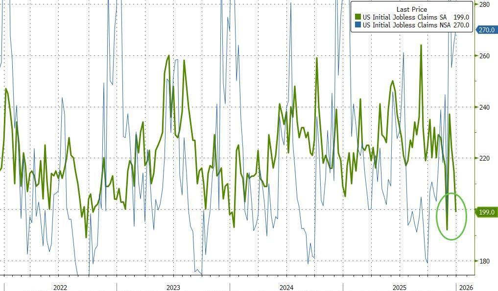 The number of Americans filing for jobless claims for the first time plummeted last week to 199k - the lowest since the Thanksgiving week plunge and pretty much the lowest since