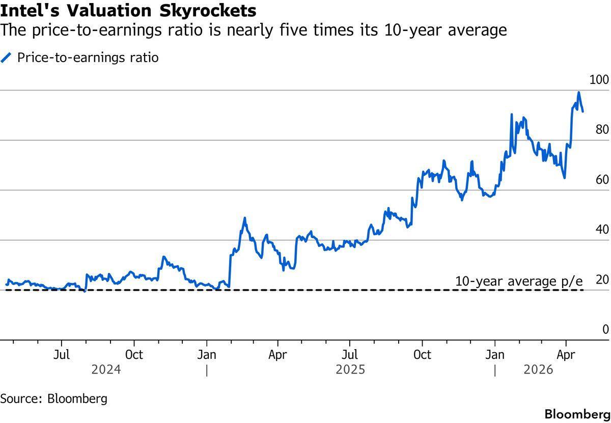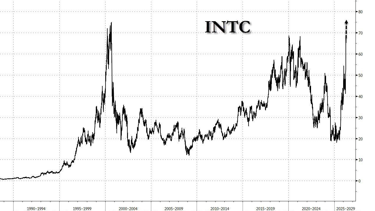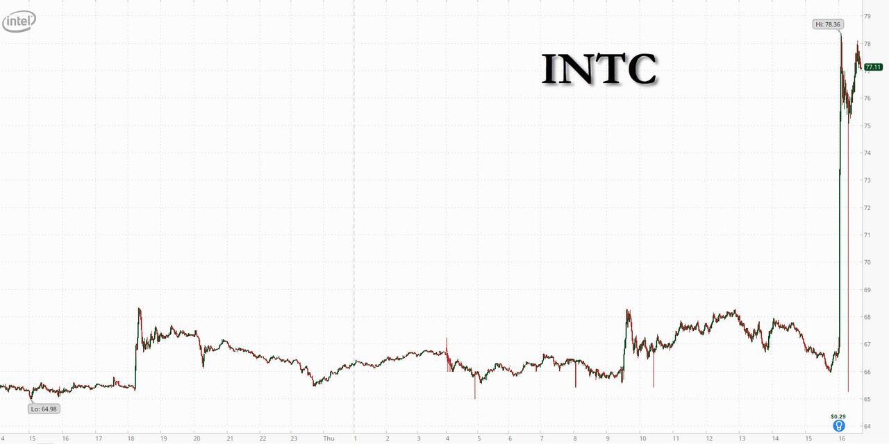 Chipmaker Intel, which less than a year ago was trading like a distressed company, and required a capital infusion from the US government, and earlier today hit a 90x forward PE...
