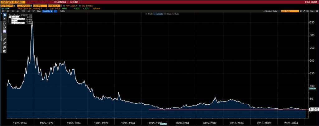 To round it all off, taking the S&P GSCI (the Goldman Commodity Index) as a proxy for the commodity sector (only because it has the longest history)…