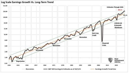 However, consumer demand is softening, input costs are sticky, savings rates are declining, and employment remains weak. Furthermore, the post-pandemic pricing power that companies once enjoyed is now fading. That certainly isn’t the recipe for a rather exuberant surge in earnings, particularly when earnings are already very deviated above the historical growth trend.