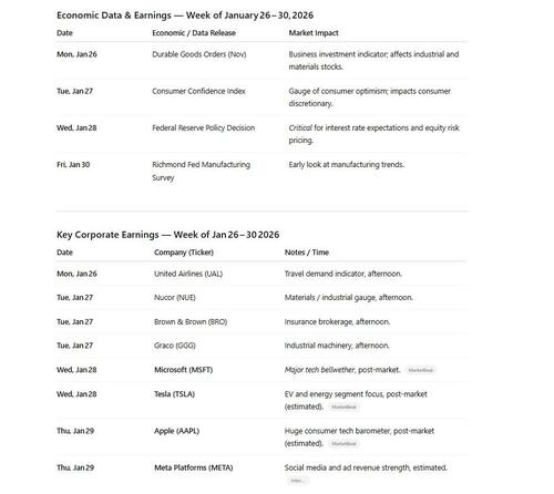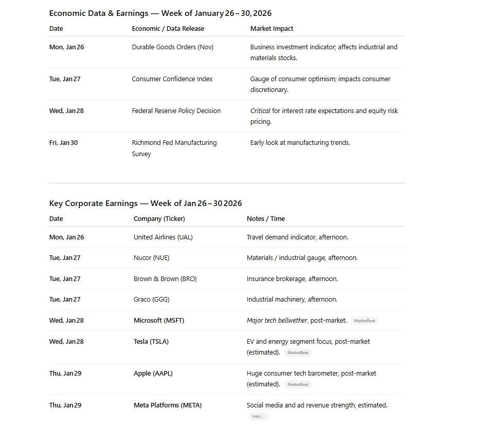 The Fed’s January meeting on the 28th looms large as a pivotal catalyst. With inflation still above target and short‑term yields higher, any shift in language on rate cuts or growth expectations could move stocks and bonds sharply. Early-week economic reports, such as durable goods orders and consumer confidence, will set the tone, but it is the big tech earnings mid‑week that have traders bracing for impact. Microsoft, Tesla, Apple, and Meta Platforms are reporting results that will deeply influence the narrative on sector rotation, growth sustainability, and the pricing of risk assets. Stocks with wide exposure to consumer demand, cloud and AI adoption, and discretionary spending will be heavily scrutinized, with guidance statements likely to matter more than quarterly beats or misses. Given the market’s recent sensitivity to earnings guidance, any signs of softening demand or caution in capex could quickly alter the technical landscape.