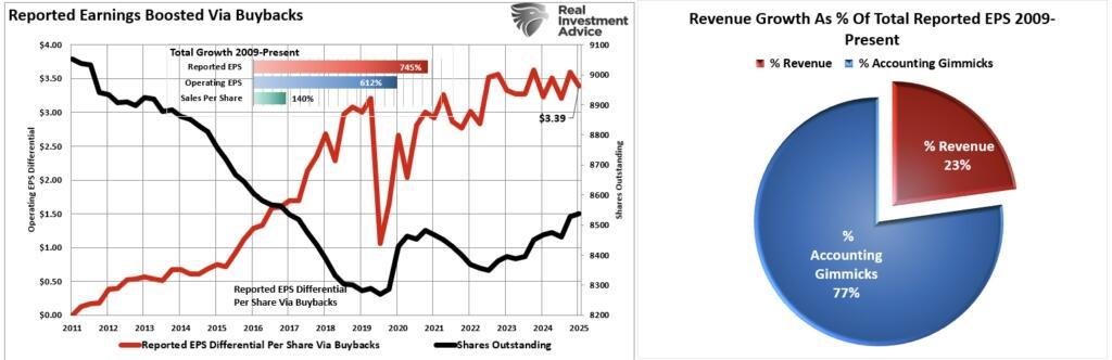 Recent quarters have delivered strong earnings surprises, but much of that upside came from aggressive cost-cutting and financial engineering rather than organic revenue growth. We can see this in the breakdown of earnings between accounting gimmicks and actual revenue growth.