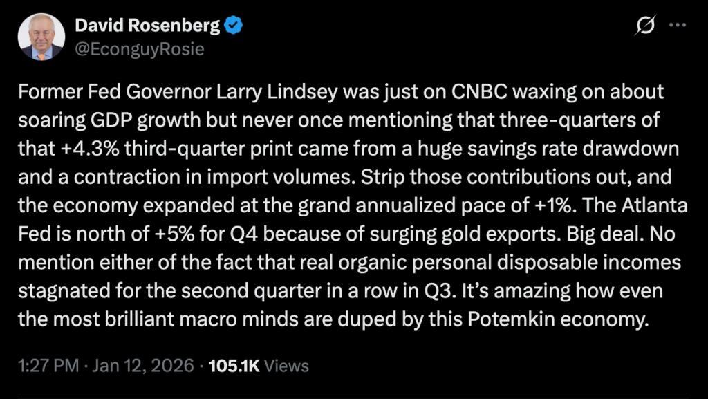 As I discussed at the 2026 Investment Summit last weekend, the prevailing market narrative is simple: inflation is falling, the economy is growing, and central banks will continue to cut rates. In other words, 2026 is a year of “reflation.” However, none of these assumptions is guaranteed. Inflation is proving sticky, central banks are closer to pausing rate cuts, and, most importantly, economic growth is currently a function of one-off issues, as David Rosenberg recently noted.