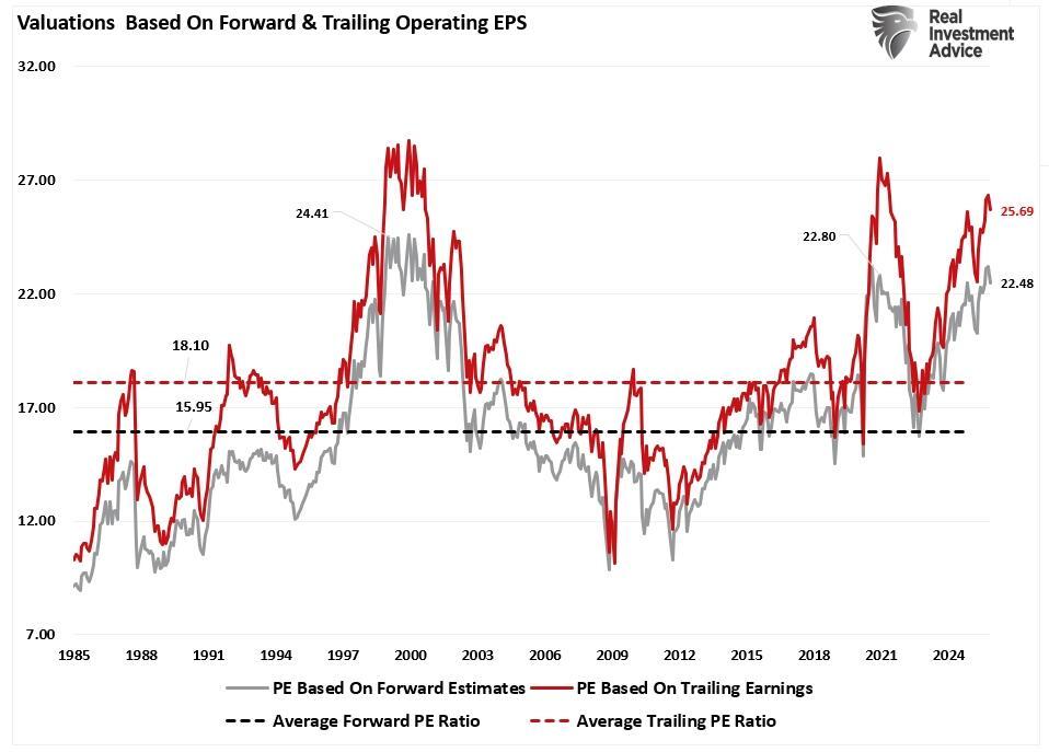 However, valuations are the one investment risk that should not be ignored, but understood. As discussed previously, valuations are a terrible timing indicator, but rather a measure of sentiment in the near term. The current trailing twelve-month price-to-earnings ratio sits at 26, near historic extremes. The Shiller CAPE ratio, which adjusts for inflation and smooths cycles over a decade, stands near 39. Forward P/E estimates for 2026 earnings are in the 23 range. By almost every measure, equities are priced at levels that historically limit future returns.