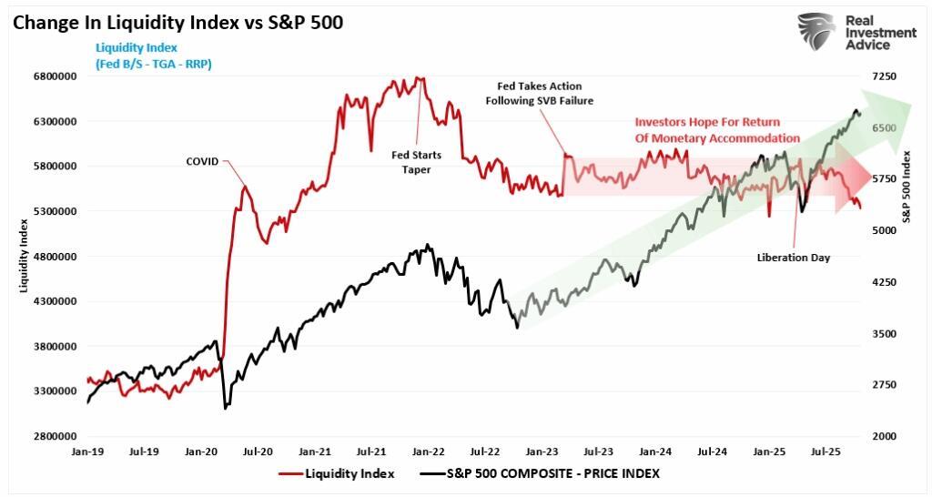 In other words, just as Pavlov’s dogs would start salivating at the “ringing of the bell,” investors are “chasing speculative assets” simply on the assumption that the “food” will arrive. But, as noted, while the Federal Reserve has trained investors to “buy the dip” over the last 15 years, that market has detached from underlying liquidity. In other words, since 2022, investors have been chasing stocks higher and drifting from one “Fed statement” to the next, looking for clues as to when monetary accommodation will return.