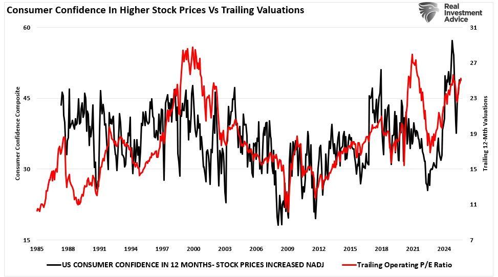 “Bernanke & Co.” successfully fostered a massive lift in equity prices, boosting consumers’ confidence. (The chart below shows the composite index of the University of Michigan and Conference Board surveys. Shaded areas are when the index is above 100.) However, since 2022, the markets have become detached from underlying economic activity as the massive stimulus and interventions continue flowing out of the economic system.