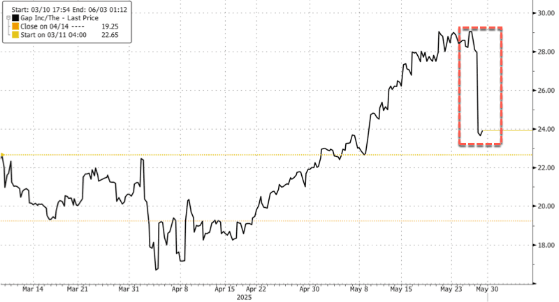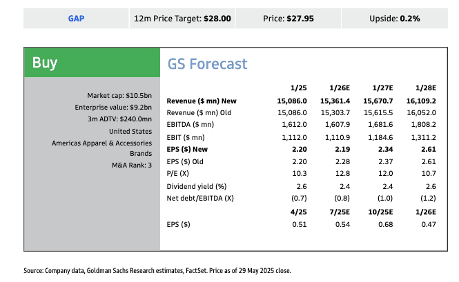 Citi analyst Paul Lejuez, who maintains a "Buy" rating on Gap, lowered his target to $30 from $33 due to the retailer's higher tariff burden.