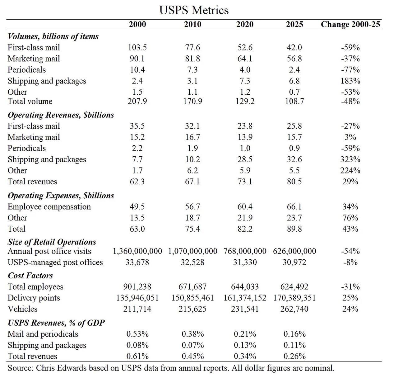 The problems outlined are extensive and, frankly, not surprising. Mail volumes have collapsed as Americans switched to faster, cheaper digital alternatives, yet USPS continues to behave like it’s still 1995. What mail remains is increasingly dominated by low-value marketing material, while the agency struggles to compete in package delivery against companies that actually specialize in logistics.