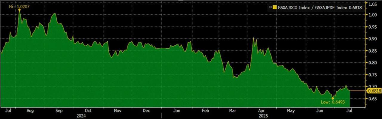 Tail scenario where the LDP/Komeito lose its majority by a wide margin and the Ishiba cabinet is replaced. This scenario would likely have negative implications for tariff talks in near term, but would imply more expansionary fiscal policy in the future. In addition, Ishiba’s removal will have significant negative implications for Defense spending. In this case, the desk likes buying Domestic Consumption names that would benefit from fiscal expansion, paired with a short in Defense for a net market neutral implementation.