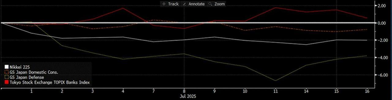 If LDP/Komeito maintain a majority (“status quo”), we likely will see a reversal of MTD price action (chart below). We would expect a relief rally in equities on reduced political uncertainty. At a sector level, defense would likely be a key beneficiary (PM Ishiba supports increased defense spending). As for trade talks, this outcome should have relatively more positive/neutral impact as any change in leadership would be likely to cause further delays. Banks have outperformed in recent weeks and could correct.