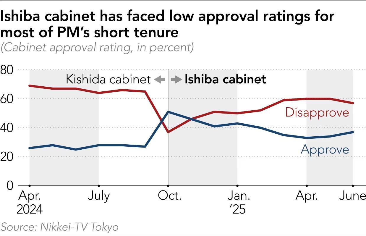 A loss for Ishiba, who has struggled with low approval ratings throughout his short tenure, will also complicate Japan's trade negotiations with the U.S., with the Aug. 1 deadline to avoid a threatened 25% "reciprocal" tariff fast approaching. "A defeat of the LDP-Komeito coalition may raise concerns about no deal," said economists at UBS.