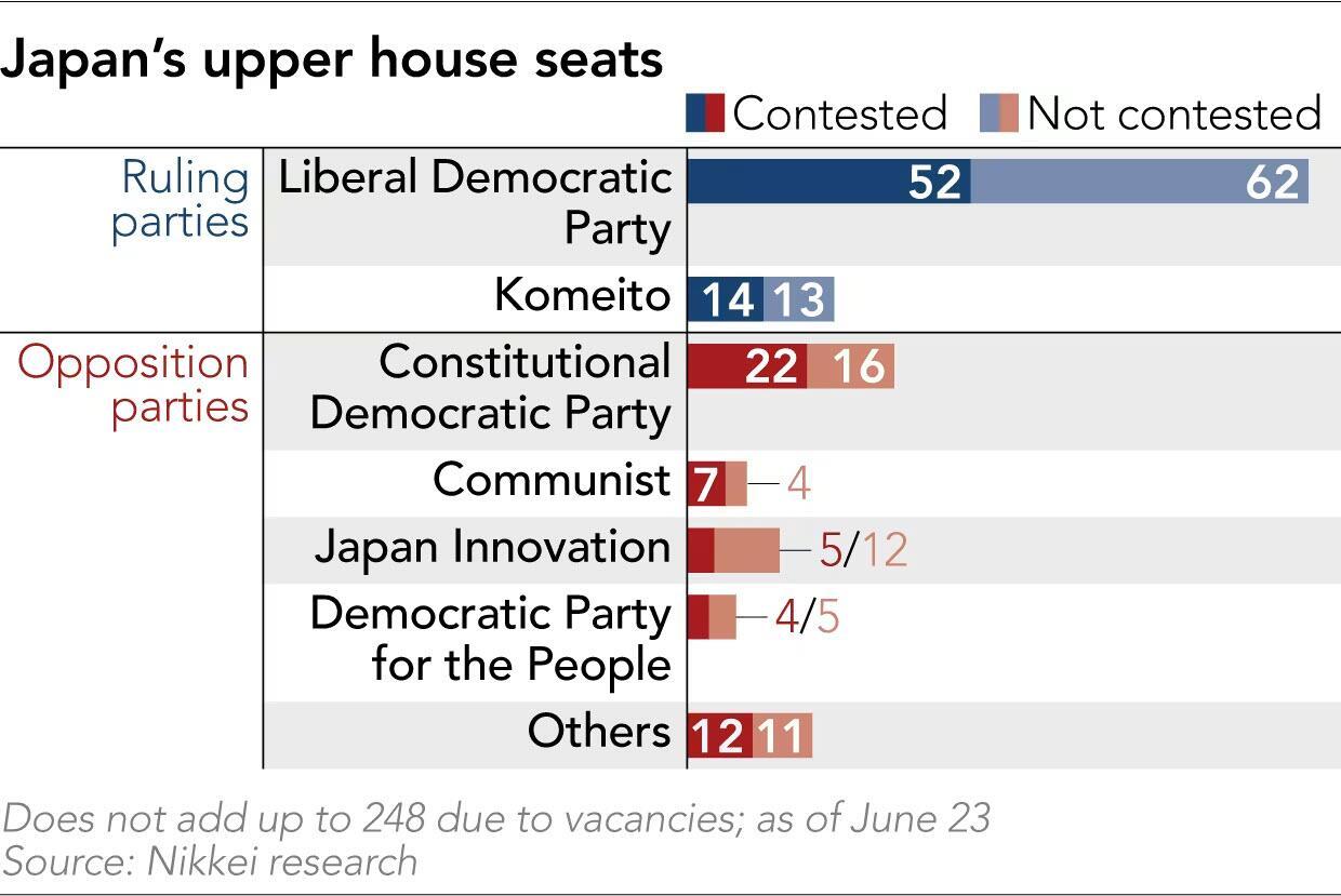The Liberal Democratic Party, which has been the ruling party for most of Japan's postwar history and coalition partner Komeito need 50 seats to maintain a majority in the upper house. But according to Nikkei and various local media outlets, that looks increasingly challenging, based on recent polls.