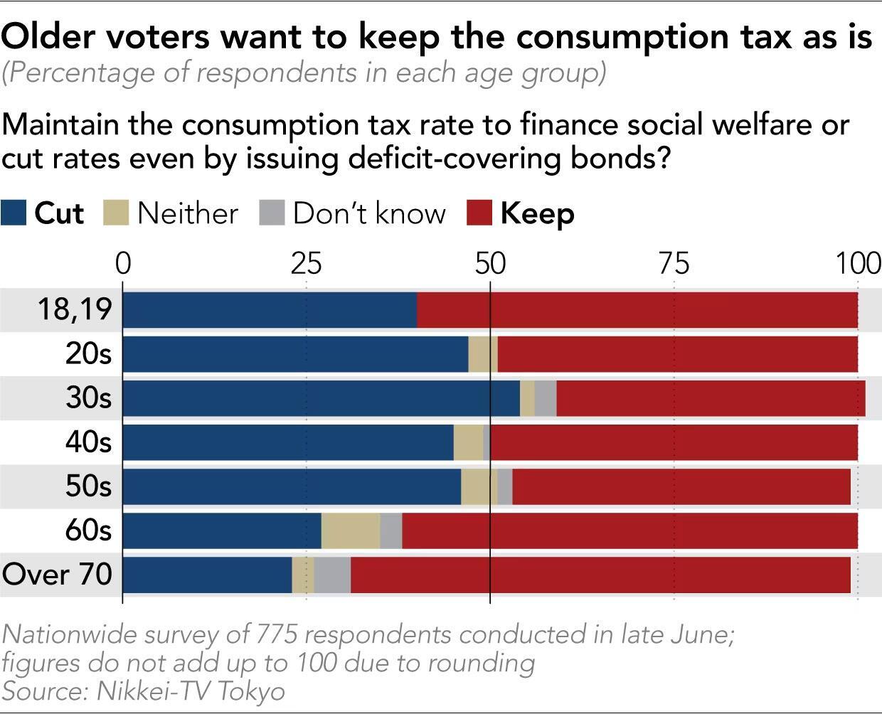 Among various age groups, those in their 60s and the over-70s strongly support holding the consumption tax rate - 10% for general goods and 8% on food items - steady. The LDP enjoys its strongest support among older voters, the poll showed.