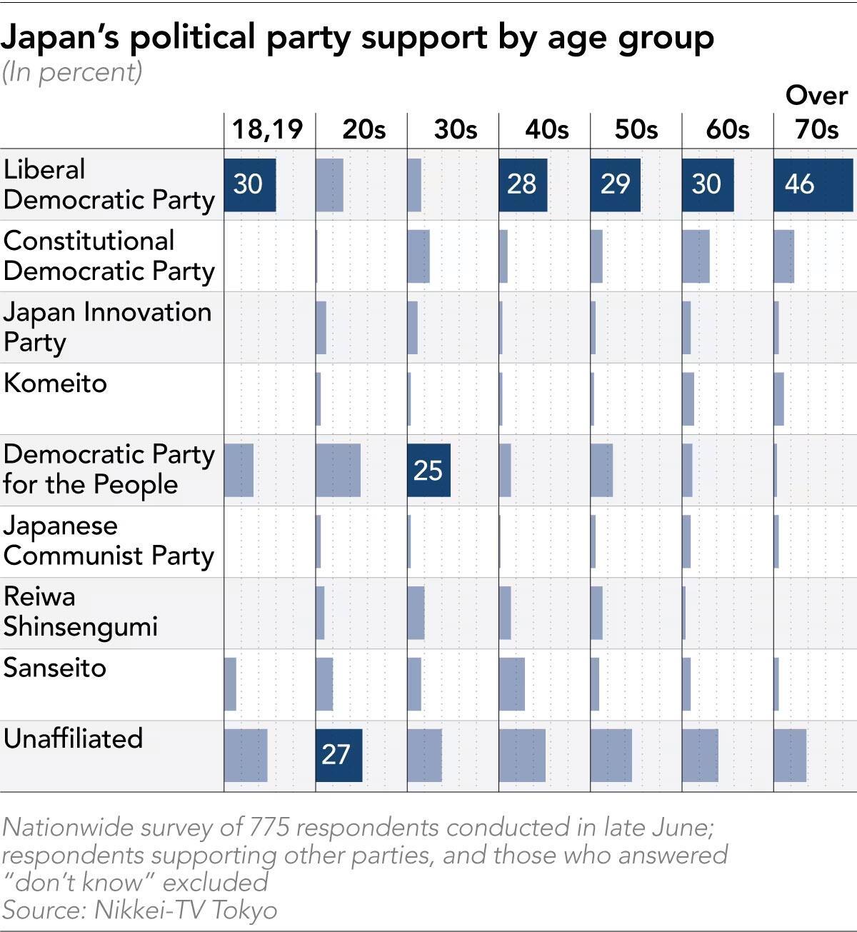 Support for Sanseito, according to the Nikkei-TV Tokyo poll, is highest amongst those in their 40s, a group that makes up the bulk of the so-called lost generation. This cohort began job hunting between 1993 to 2004, during a time of economic stagnation and a glut in the labor market. Unable to find stable jobs, many ended up as part-time employees or freelancers.