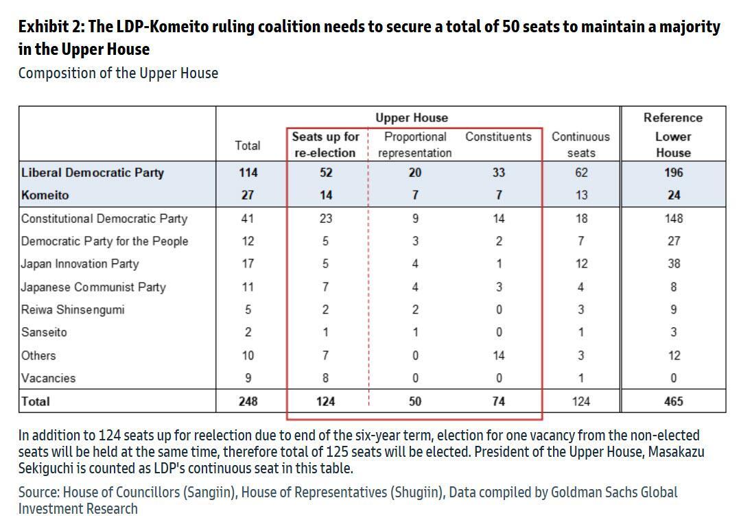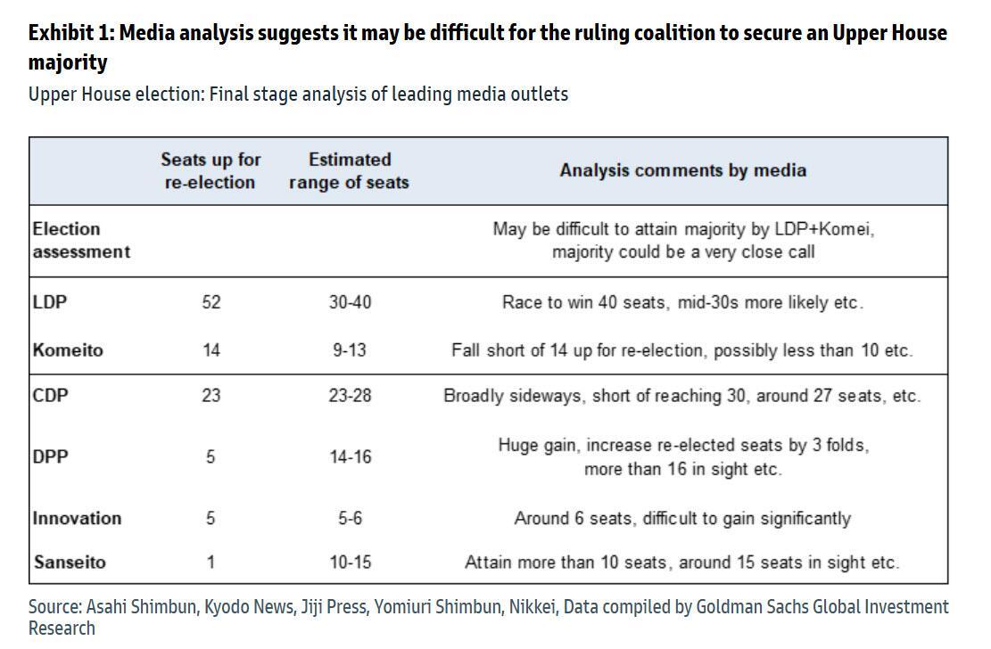 Below we present Goldman's various scenarios for the Japanese government depending on the Upper House election outcome.