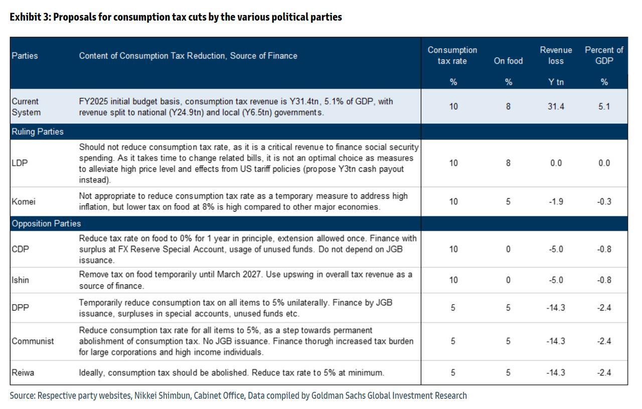 On the other hand, almost all opposition parties call for a cut in consumption tax. However, the scale of the proposed cuts, their duration, and funding sources vary widely (Exhibit 3). Whereas the CDP and Japan Innovation Party suggest a temporary 1-2 year reduction limited to food and funded without relying on additional JGB issuance, the DPP proposes a uniform reduction in consumption tax to 5%, funded by JGB issuance.