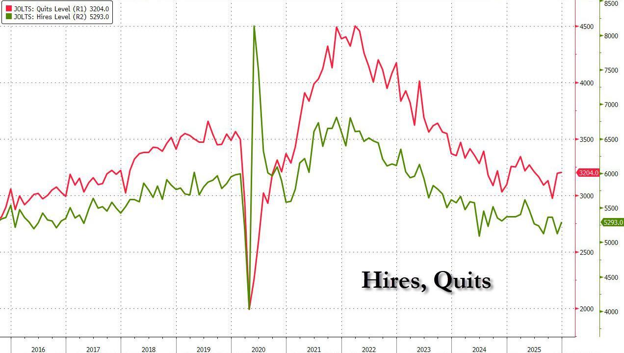 The small silver lining to today's otherwise terrible JOLTS print was that the number of hires and quits both rose modestly, the former up to 5.293 million from 5.121 million, while the latter rose from 3.204 million from 3,193 million.