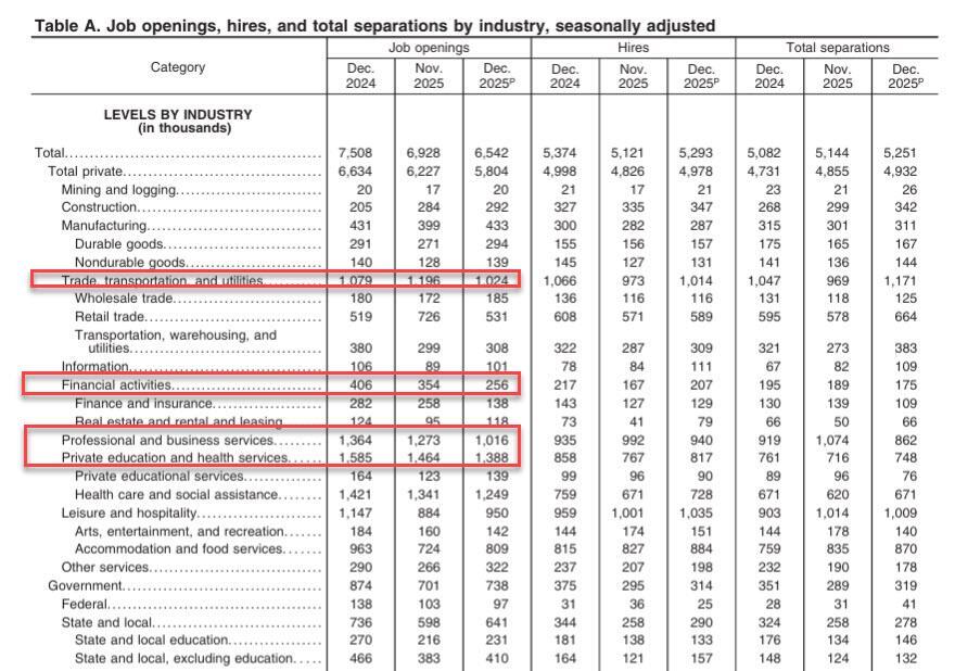 According to the BLS, the number of job openings decreased in professional and business services (-257,000), retail trade (-195,000), and finance and insurance (-120,000).