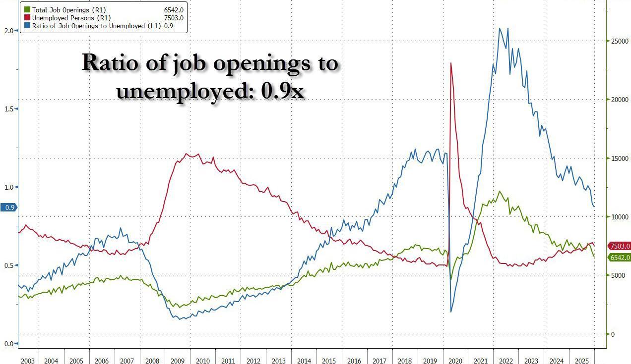 As a result of the deteriorating job openings picture, the ratio of job openings to unemployed workers tumbled to 0.9x, the lowest since early 2021.