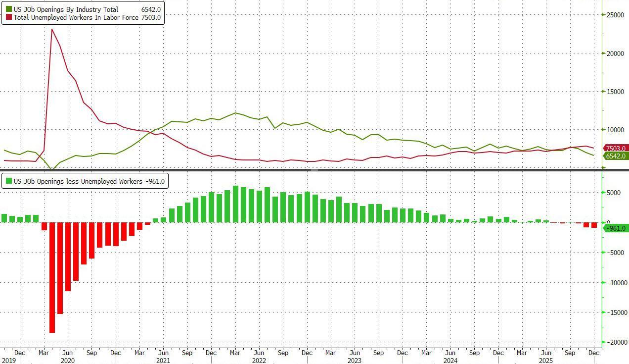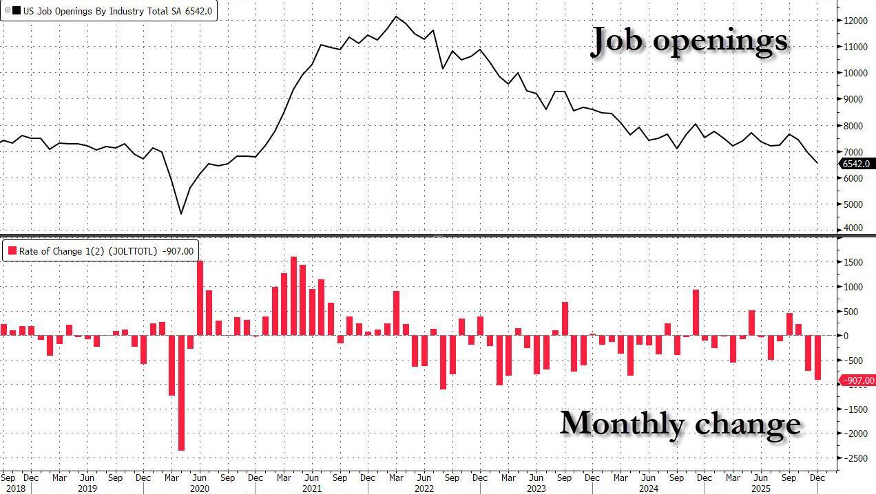 We warned earlier today that the US labor market was rolling over sharply again when we observed the surge in initial jobless claims and the near record January for job cuts (biggest since 2009). Moments ago the BLS confirmed that the US job market is indeed falling off a cliff, when the latest JOLTS report (job openings and labor turnover) showed that in December the number of US job openings crashed by 604K to 6.542 million from 7.146 million, the biggest one month drop since Oct 2023. Of course, to make the drop a bit more palatable, the DOL decided to dramatically revised the November number lower (of course), from 7.146 million to 6.928 million, which however would have made the November plunge even worse. So to keep the monthly changes on an apple to apple basis, we take the cumulative drop from the past 2 months and find that the past two months saw a massive 907k drop in job openings, the biggest since March 2023!
