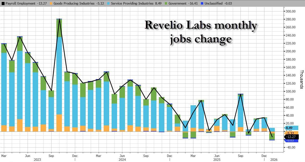 But while hiring may have rebounded (which is meaningless if layoffs rise even more), another labor market indicator that hit today suggested that next week's delayed January payrolls report will be a complete bloodbath. Earlier this morning, Revelio Labs - which had become the go to alternative while the govt data was suspended during the shutdown - reported that in January payrolls plunged by 13,270, driven by goods producing jobs which dropped by 5.1K but mostly a plunge in govt jobs, which declined by 16.4K.