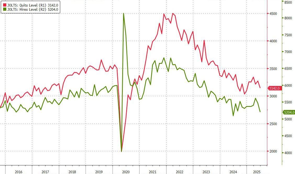 ... to just 5.204 million, the lowest in a year, and the second lowest since covid, raising questions about the stability of the US labor market. Meanwhile, the number of workers quitting their jobs - a sign of confidence in finding a better paying job elsewhere - also unexpectedly slumped by 128K to 3.142 million, also one of the lowest prints since Covid.