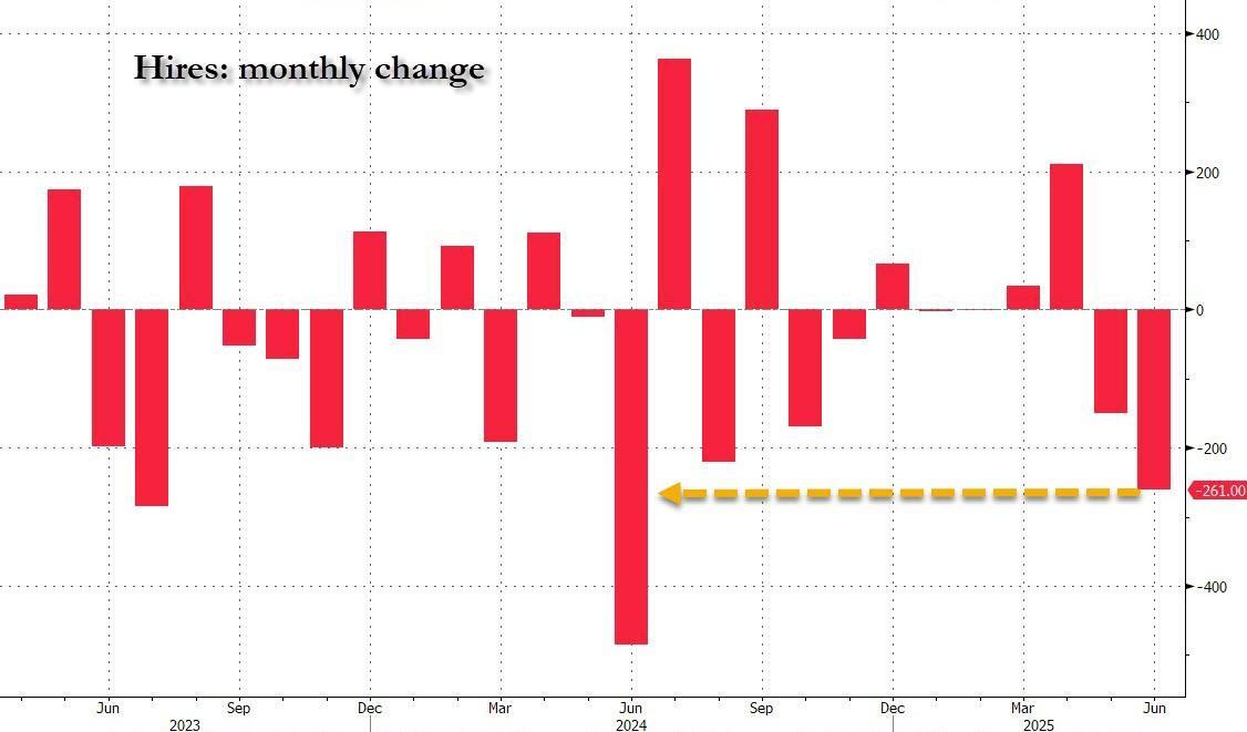 While the job openings data was in line - the drop was to be expected and the miss was modest - it was far uglier on the hiring side where the number of new hires unexpectedly plunged by 261K...