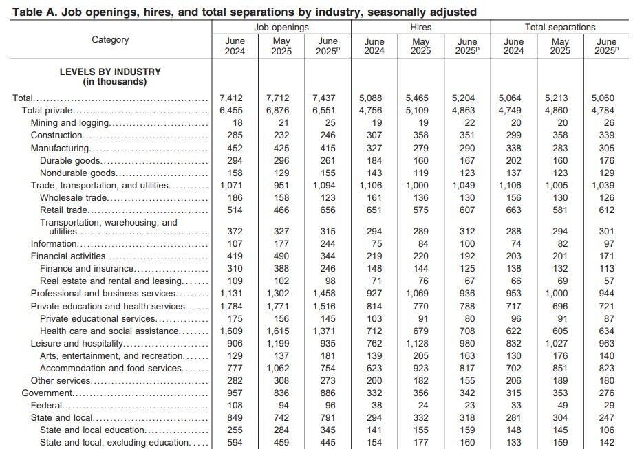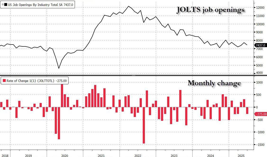 After several consecutive stronger then expected job openings reports and one month after the JOLTS report showed an unexpected surge in job vacancies, moments ago the BLS said that in June (with its usual one month lag, coming just days before the July nonfarm payrolls report), job openings in the US dropped to a lower than expected 7.437 million, down 275K from 7.712 million in May, and below the 7.5 million estimate.