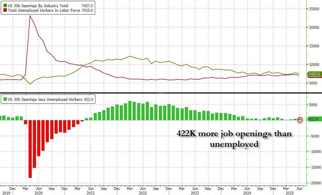 In the context of the broader jobs report, it appears the US labor market may have dodged a bullet because whereas in March the labor market was almost demand constrained, when there were just 117K more openings than jobs in the US, since then the differential has risen and in June the number of job openings was 422K more than number of employed workers, suggesting the onset of a labor recession has once again been punted.