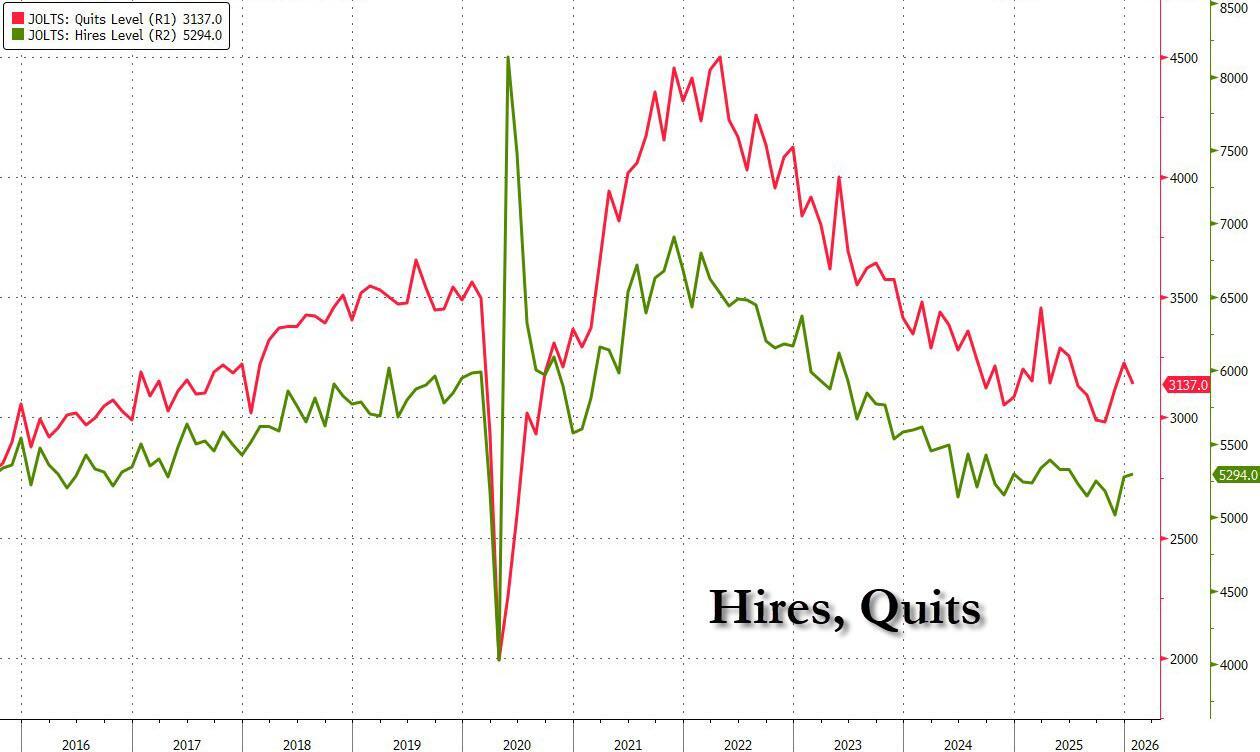 And another indication that the labor market slump may be ending, after slamming hard at the end of 2025, both the number of hires and quits has rebounded, although it is still too early to determine if this is a regime change or just a dead cat bounce.