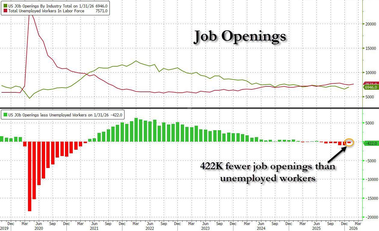 The jump in job openings means that after hitting a 5 year high, the labor demand deficit was cut in half, and in January there were 422K fewer job openings than unemployed workers, a big drop from the 953K the month prior.
