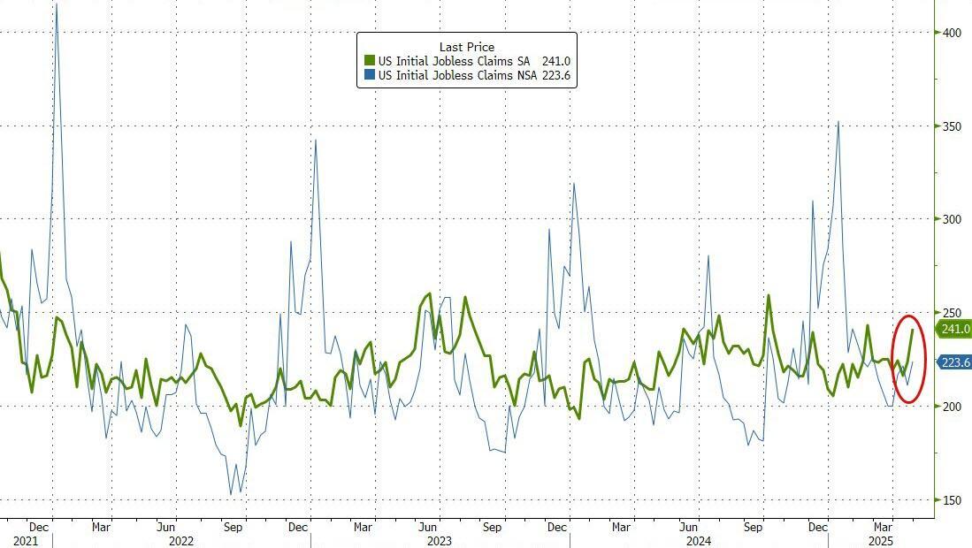 This morning we see initial jobless claims jump notably too - to 241k (higher than the 223k expected). While not out of recent norms, this is a sizable jump...