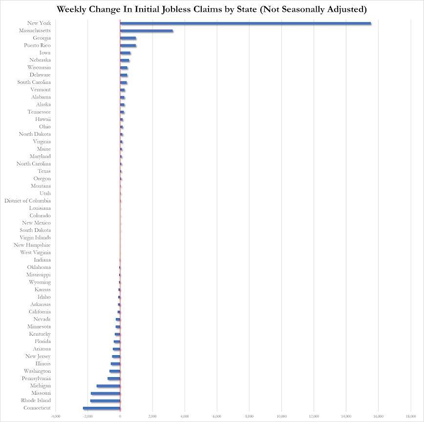 As SouthBay Research highlights, the ~80K jump in Continuing Claims is relatively broad, with core drivers being New York (+14K), California (+9K), Connecticut (+5K), New Jersey (+4K), Texas (+6K).