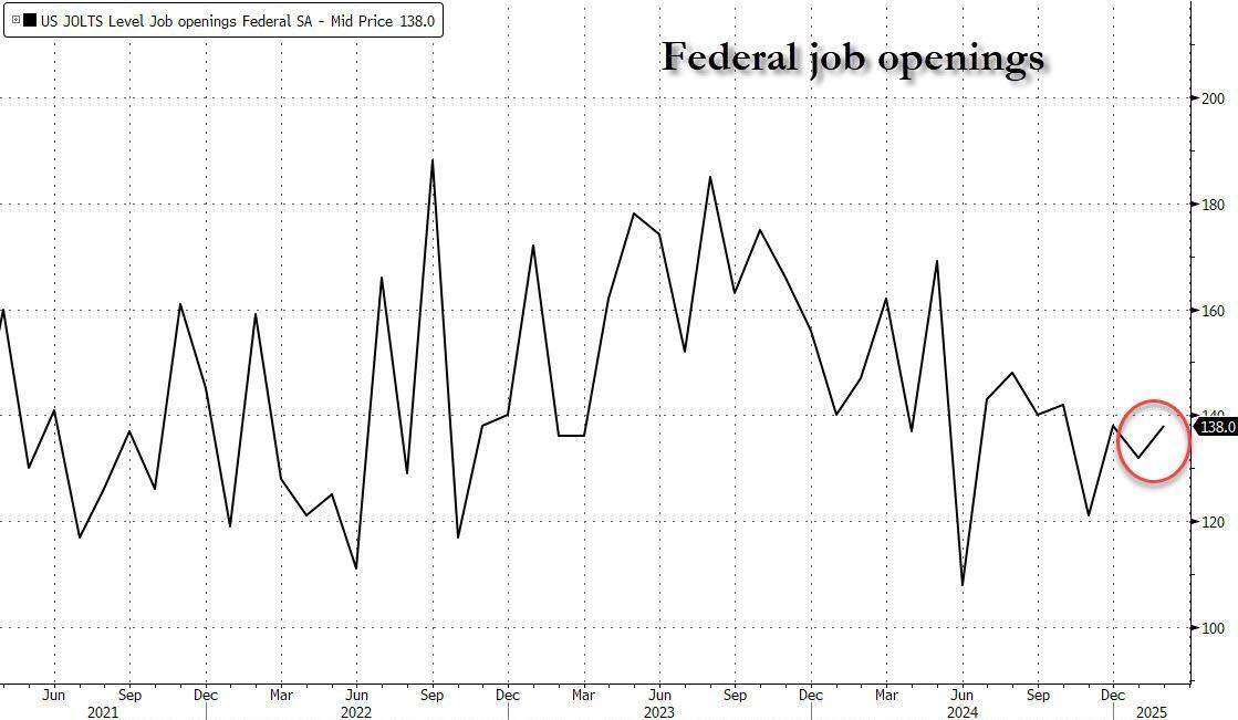 Yet, as always, there is a reason to doubt this particular set of numbers - just as there was reason to doubt every set of numbers from Biden - because according to the February JOLTS report, the number of Federal Government job openings was essentially flat both sequentially and YoY.