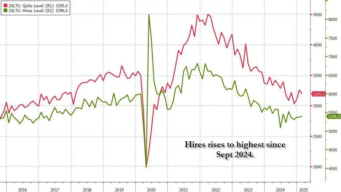 While the job openings data was a drop, miss and reversal of last month's surprise increase, what softened the blow is that the number of hires unexpectedly rose to 5.396 million from 5.371 million, the highest since last October, and hardly screaming collapse in the labor market. Meanwhile, after surging in January, the number of workers quitting their jobs - a sign of confidence in finding a better paying job elsewhere - dropped slightly to 3.195 million from 3.256 million.