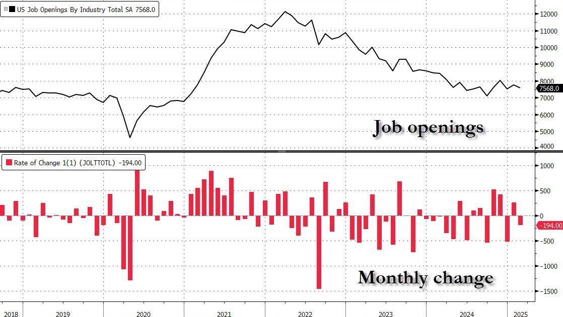 It's possible that after surprising the market last month when we saw one of the a sizable increase in the number of job openings, Trump got the tap on the shoulder that the US market should probably continue shrinking slowly but surely, if his plan is to (still) blame Biden for any imminent recession, and so he sent a memo to the BLS to make sure that the numbers aren't in freefall, but dropping more gradually.