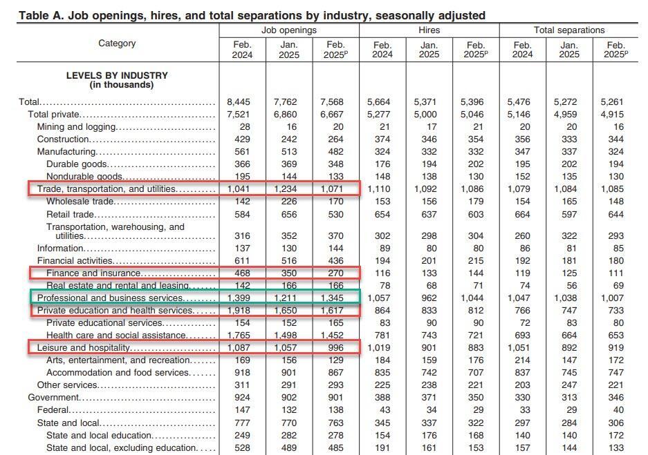 One month after we got a "goldilocks" JOLTS report which showed an unexpected increase in job openings, hires and quits, moments ago the BLS reported that the US labor market reverted to its deteriorating trendline in February when the US had 7.568 million job openings, a drop from the 7.762 million in January (revised from 7.740 million), down 877,000 from a year ago, and below the 7.655 million estimate.