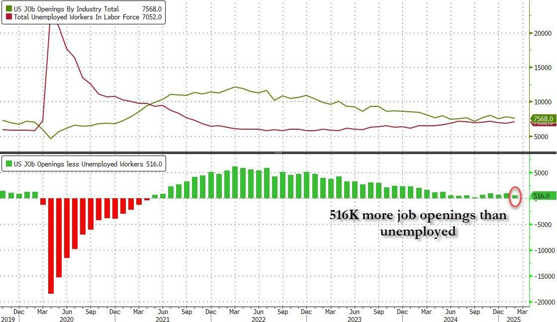In the context of the broader jobs report, in February the number of job openings was 516K more than the number of unemployed workers (which the BLS reported was 7.052 million), down from 913K the previous month, and one of the lowest differentials since the covid crash.