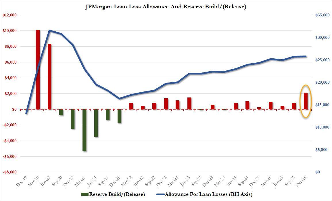 Especially notable is that in Q4, JPM's reserve build soared to $2.1BN, highest since Covid, reflecting $2.2BN reserve established for forward purchase commitment of Apple credit card business, which must have been an epic disaster under Goldman. Combined with $2.51BN in charge offs (which was below estimates of $2.56BN), this meant that total credit costs were a whopping $4.7 billion, also highest since covid.