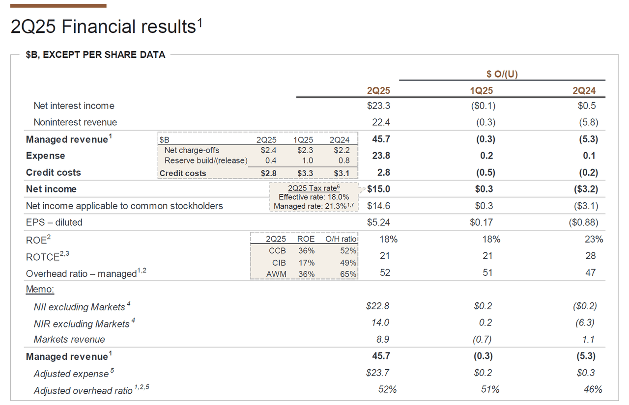 The effective tax rate for the company was 18.0%, below the 21.3% managed tax rate. This is notable because the bank discussed a “significant item” which appears to be an income tax benefit that represents $774 million of net income (and $0.28 of earnings per share). Some more from a footnote: “Second-quarter 2025 net income, earnings per share and ROTCE excluding the $774mm income tax benefit are non-GAAP financial measures. Excluding this item resulted in a decrease of $774mm (after tax) to reported net income from $15.0B to $14.2B; a decrease of $0.28 per share to reported EPS from $5.24 to $4.96; and a decrease of 1% to ROTCE from 21% to 20%. Management believes these measures provide useful information to investors and analysts in assessing the firm’s results.”