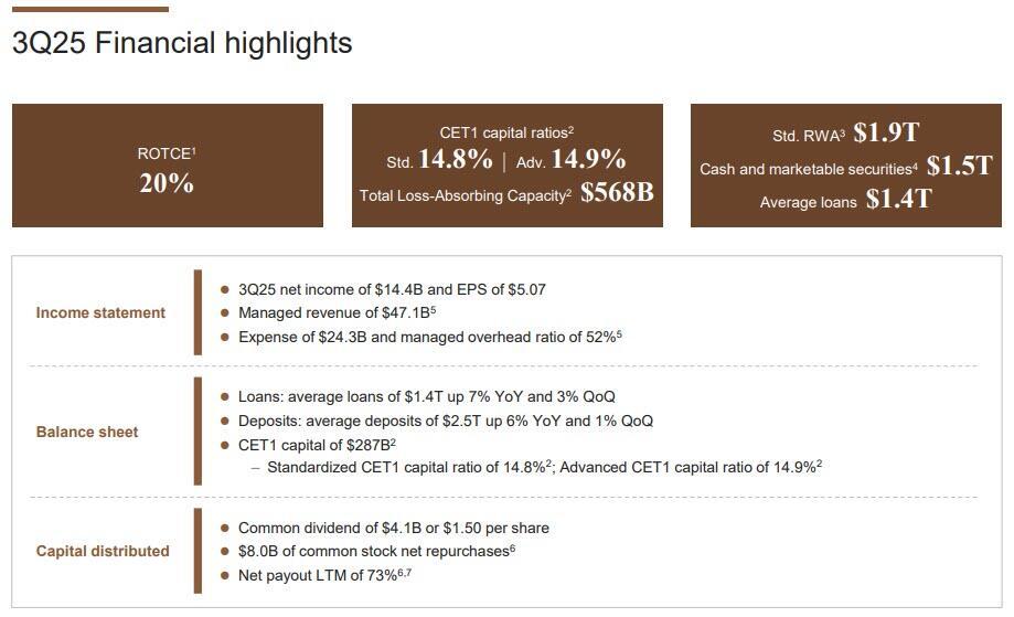 Starting at the top, JPM reported Q3 revenue which beat by almost $2 billion, thanks to another quarter of stellar FICC and equity sales and trading, with investment banking also coming strong and advisory rounding out the segments that beat. The bottom line was Net Income of $14.4 billion, a solid beat to consensus expectations, and a 14% increase YoY.
