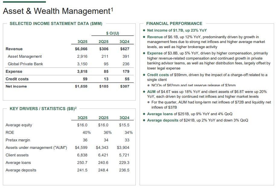Turning to the bank's asset and wealth management division, the booming stock market continues to be a major boost here, with assets under management rising 18% to $4.6 trillion, while client assets rose 20% to $6.8 trillion as a result of both net inflows and rises in markets. And talking of ROEs, asset and wealth management also managed a respectable 40% return on equity in the last quarter. This was a rise of 6 percentage points year-on-year.
